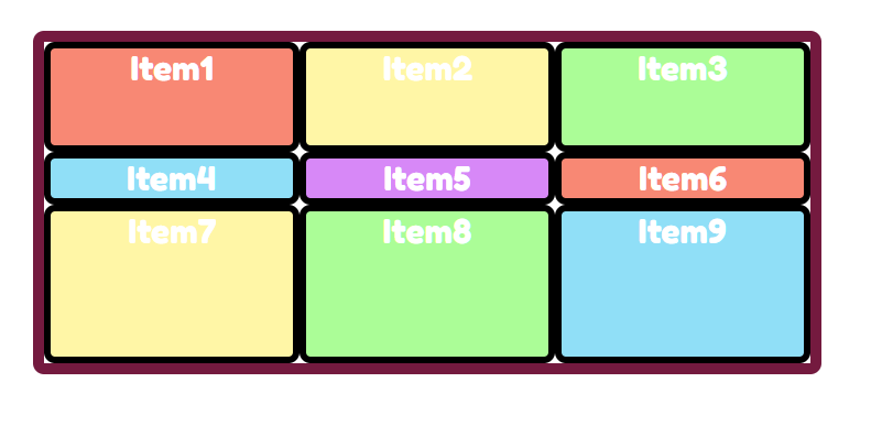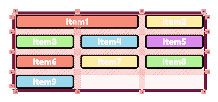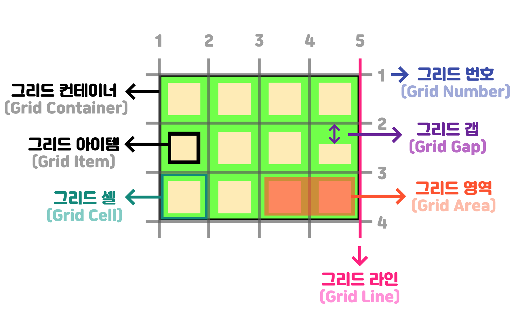 - 그리드 아이템 (Grid Item) : 컨테이너의 자식 요소들. 그리드에 의해 배치되는 요소들.